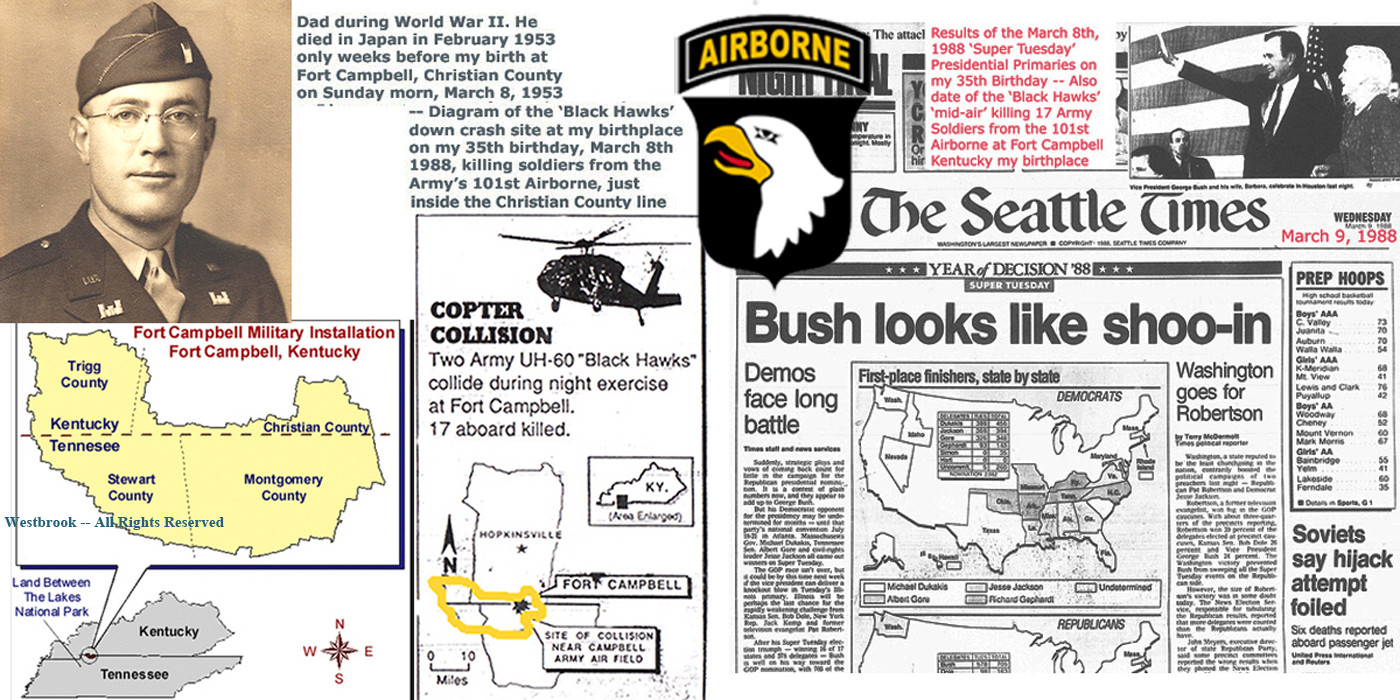 My father reportedly died in Yokahama, Japan in January 1953, only weeks before my birth at the U.S. Army hospital at Fort Campbell, Christian County, Kentucky on March 8, 1953 and although she was only just a month shy of age 5, my sister Mary, who died in 2004, told me how she was holding my father's hand when he collapsed in a train and fell down at her feet. -- This differs from official accounts that I have read in the Nashville newspapers.